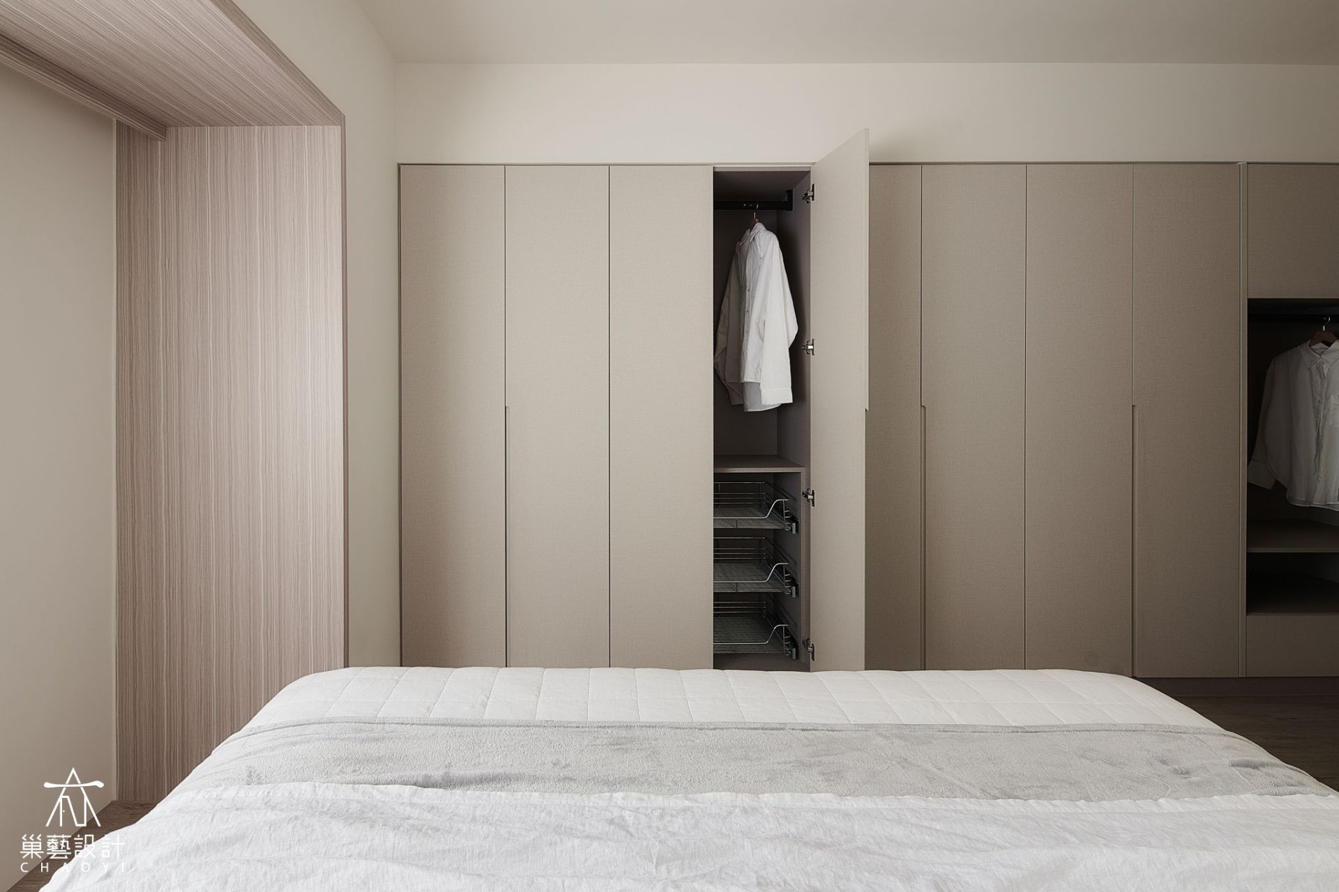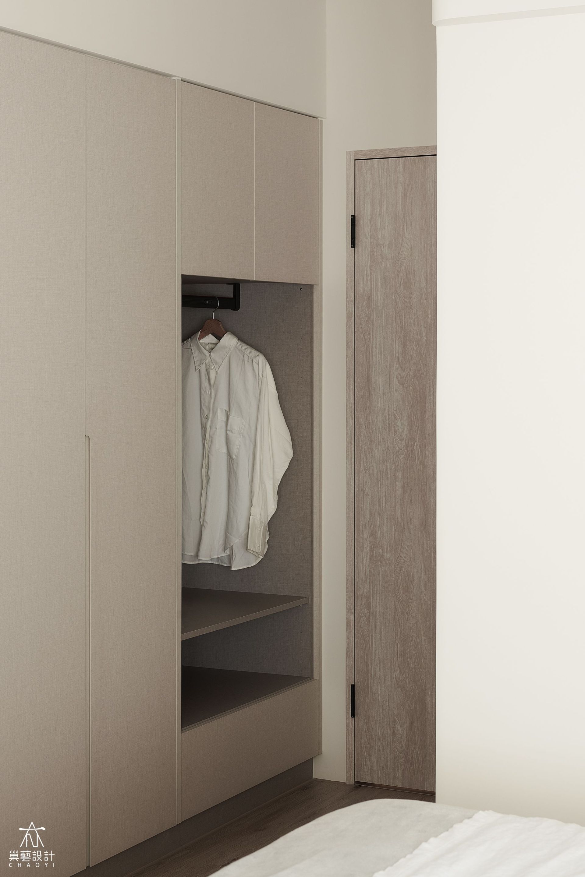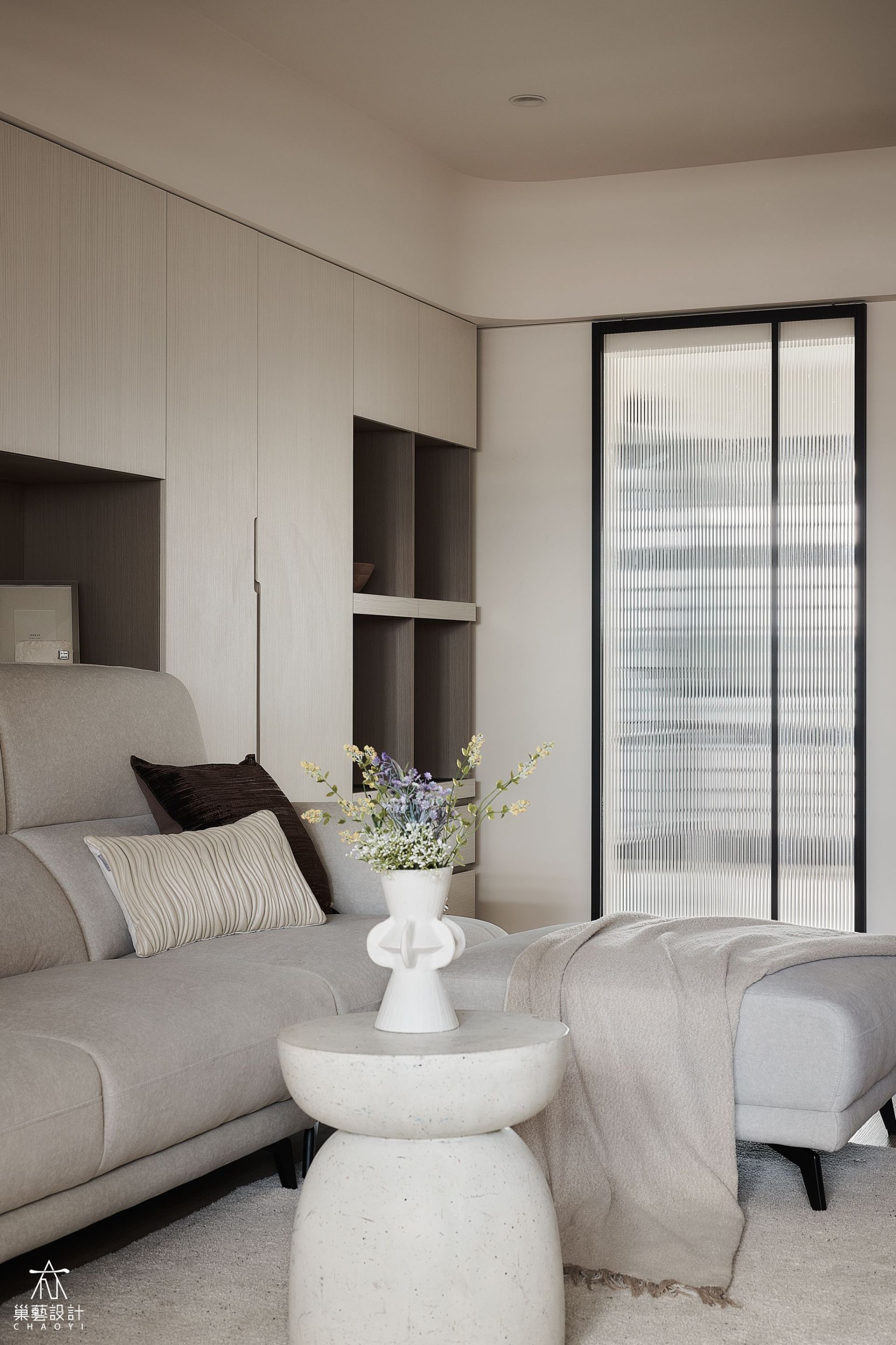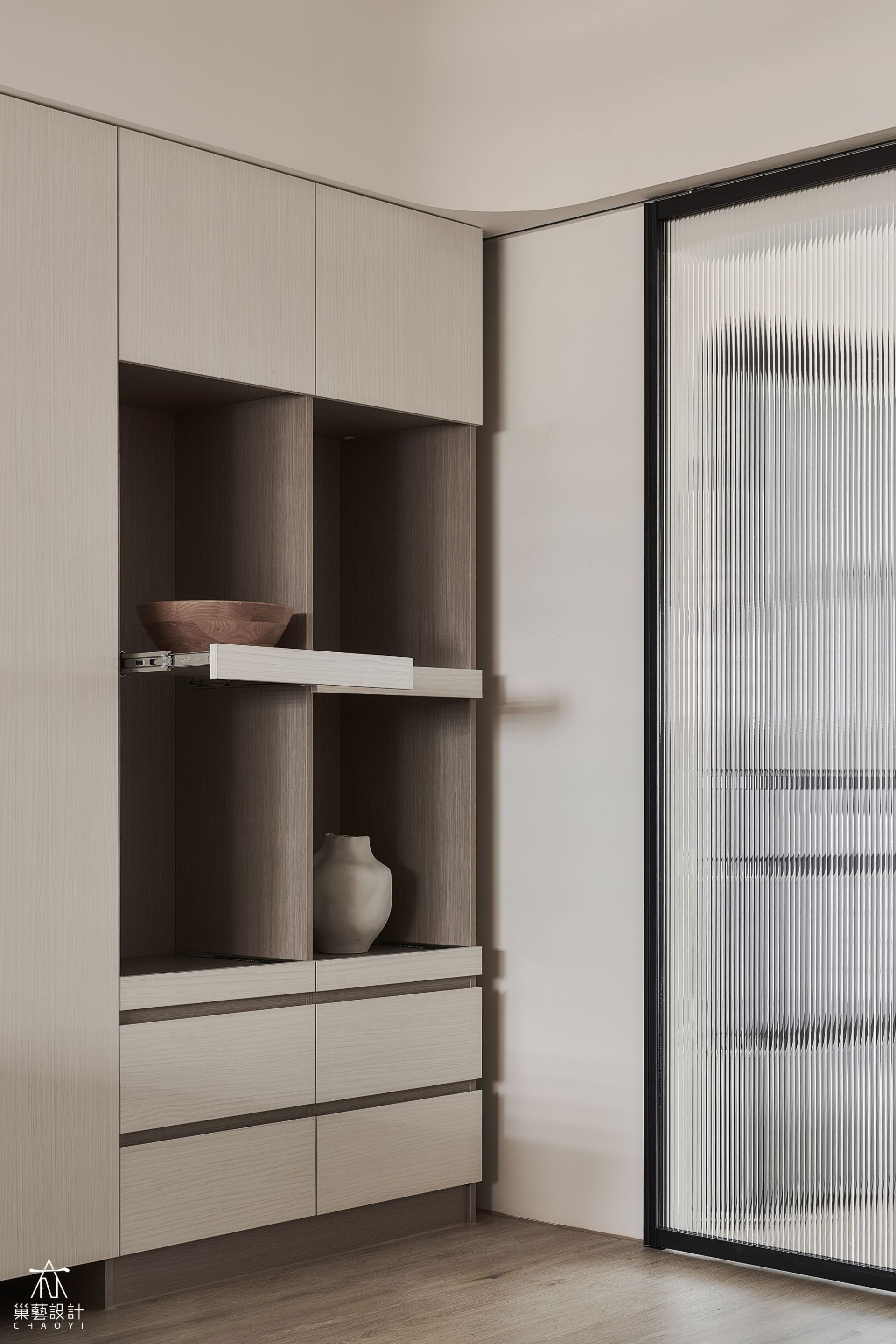 進入玄關,利用畸零空間,設置收納櫃兼具穿鞋椅,鞋櫃兼具汙衣櫃的功能,讓空間更為實用且充滿巧思,小冰柱門片則隔開了廚房與客廳,不僅保持空間的通透性,也兼具了美觀與實用性,更讓光線柔和地灑進室內,營造出自然流動的光影氛圍。